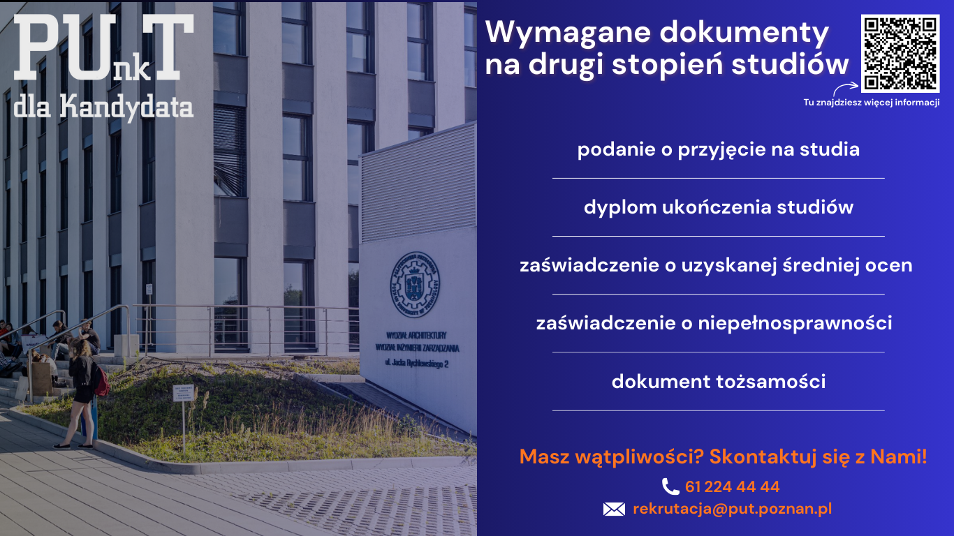 Dokumenty przyjmowane będą w budynku A30 Wydziałów Architektury i Inżynierii Zarządzania przy ul. Jacka Rychlewskiego 2 w Poznaniu zgodnie z poniższym harmonogramem: