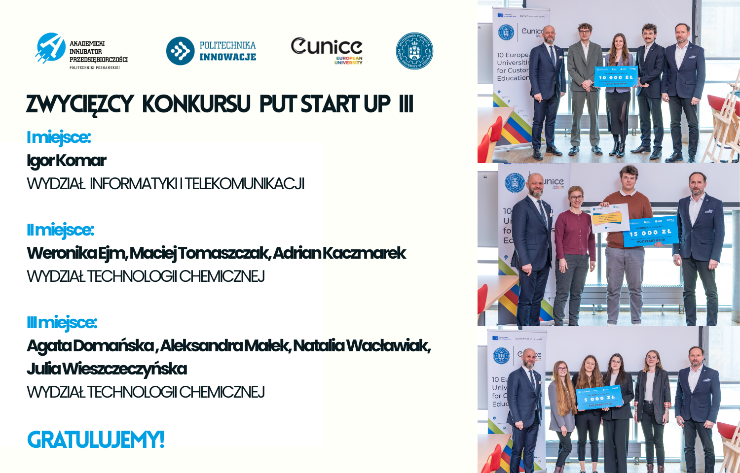 Zwycięzca konkursu będzie reprezentował Politechnikę Poznańską podczas międzynarodowego konkursu EUNICE Imagine Innovation Cup 2026, który odbędzie się w Poznaniu. Trzymamy kciuki za dalsze sukcesy!