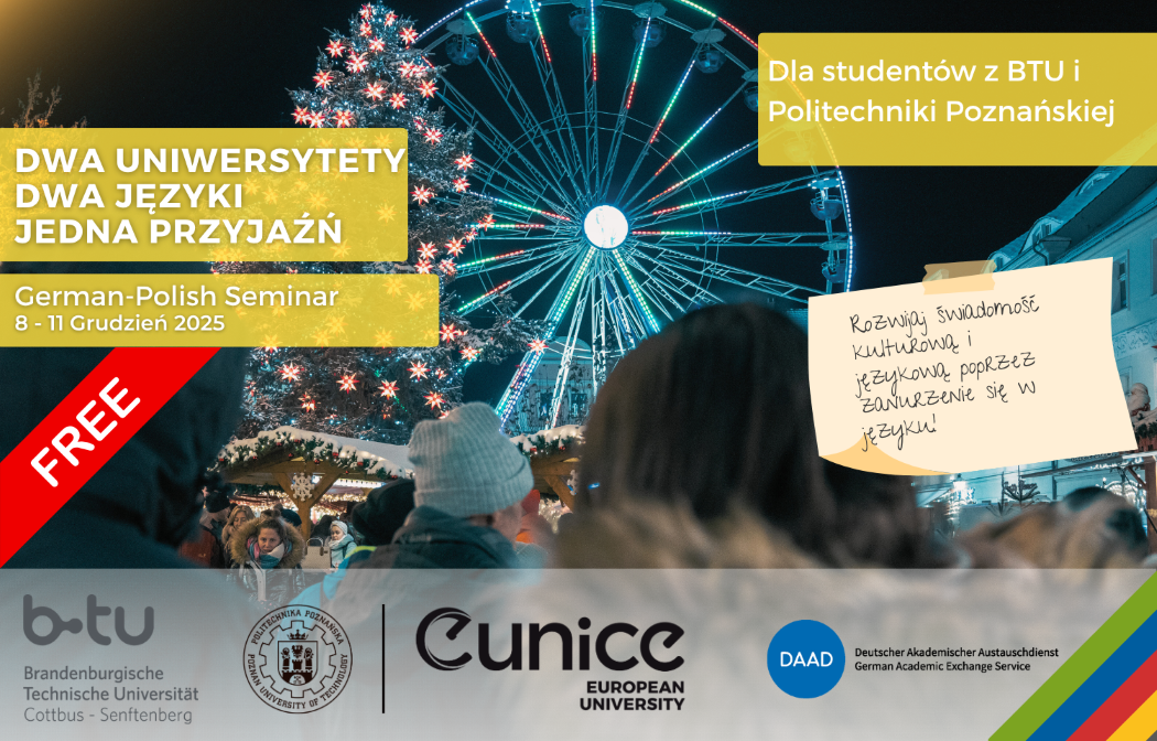 Nie przegap swojej szansy i weź udział w polsko-niemieckim seminarium "Dwa uniwersytety. Dwa języki. Jedna przyjaźń", organizowanym wspólnie przez Centrum Języków i Komunikacji Politechniki Poznańskiej (PP) i Brandenburski Uniwersytet Techniczny Cottbus-Senftenberg (BTU).