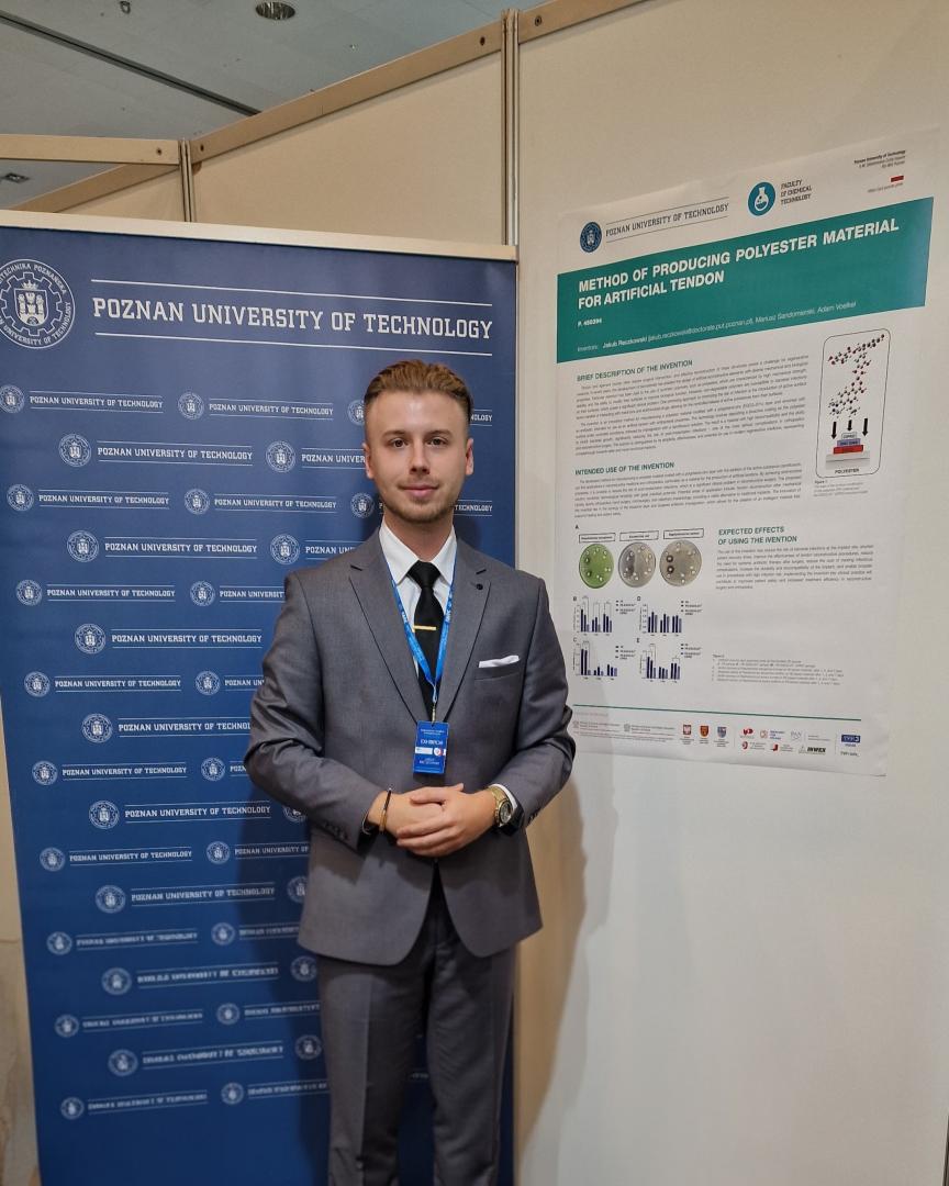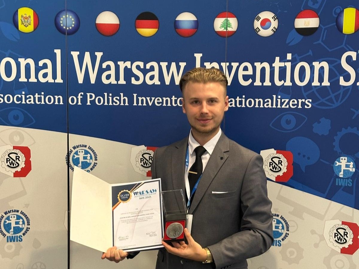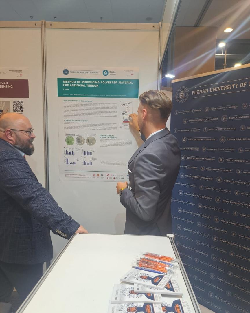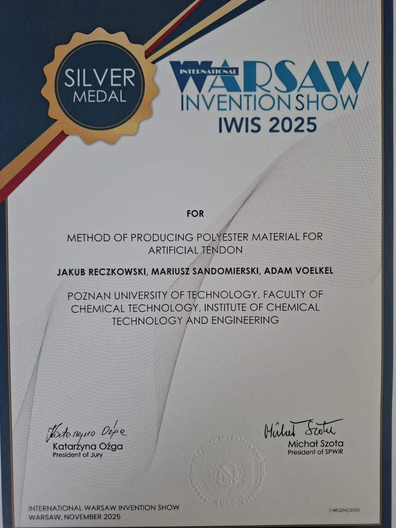 Z przyjemnością informujemy, że srebrny medal IWIS 2025 otrzymało rozwiązanie opracowane w Instytucie Technologii i Inżynierii Chemicznej Wydziału Technologii Chemicznej PP, zatytułowane: „ Sposób wytwarzania materiału poliestrowego z przeznaczeniem na sztuczne ścięgno” („Method of producing polyester material for artificial tendon”).
