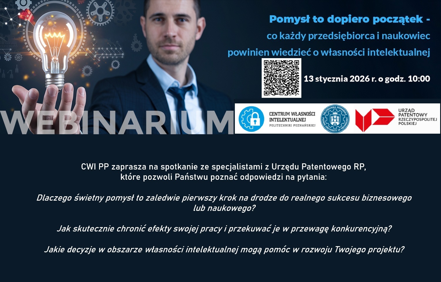 CWI PP zaprasza na spotkanie ze specjalistami z Urzędu Patentowego RP w formie webinarium, które odbędzie się dnia 13.01.2026 r. w godz. 10:00-11:30.