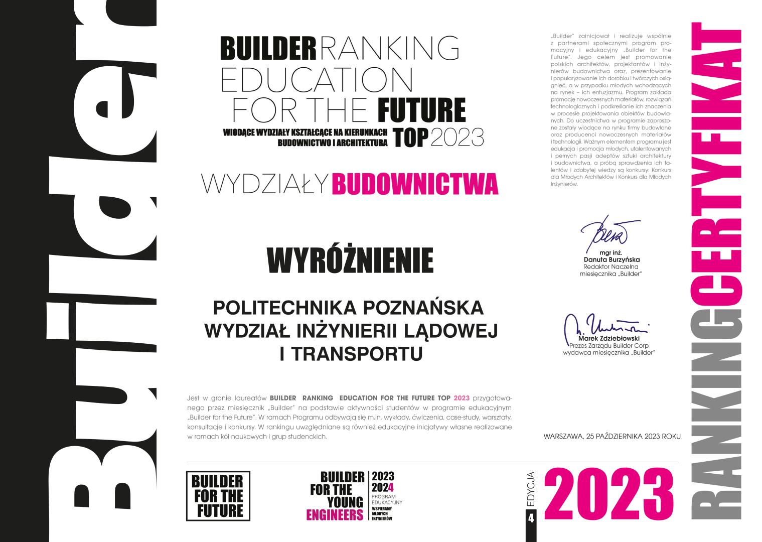 Podczas uroczystości zostały wręczone nagrody dla najlepszych Wydziałów Budownictwa i Architektury polskich uczelni technicznych, w ramach BUILDER RANKING EDUCATION FOR THE FUTURE TOP 2023. Z dużą przyjemnością chcielibyśmy podzielić się informacją, że wśród nagrodzonych i wyróżnionych wydziałów znalazł się WYDZIAŁ ARCHITEKTURY PP (III miejsce) oraz WYDZIAŁ INŻYNIERII LĄDOWEJ I TRANSPORTU PP (wyróżnienie).